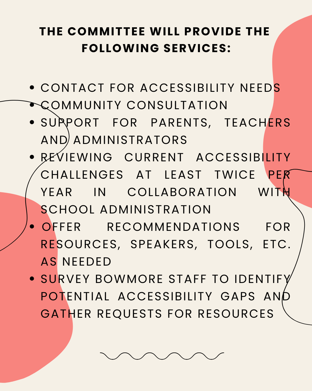 The Accessibility Committee will highlight and address educational barriers (I.e physical, attitudinal, intellectual, etc.) working towards increasing access to education for all children in the Bowmore community. The co-learning model will guide decision-making processes ensuring a unified approach while pursuing our community centred goals. The committee will provide the following services: