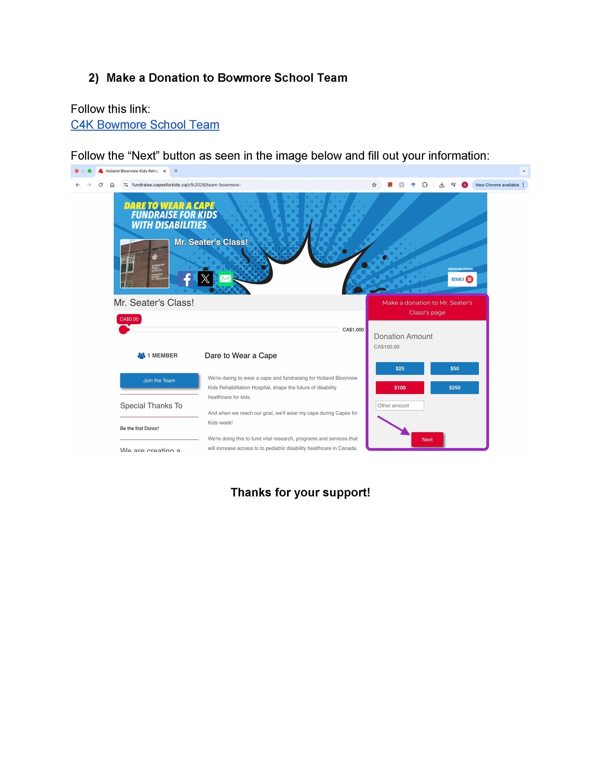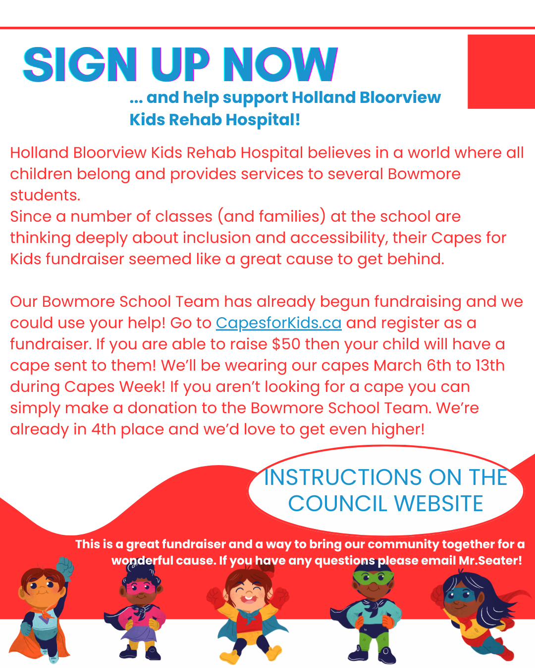 Our Bowmore School Team has already begun fundraising and we could use your help! Go to Capes for Kids and register as a fundraiser. If you are able to raise $50 then your child will have a cape sent to them! We’ll be wearing our capes March 6th to 13th during Capes Week! If you aren’t looking for a cape you can simply make a donation to the Bowmore School Team. We’re already in 4th place and we’d love to get even higher!